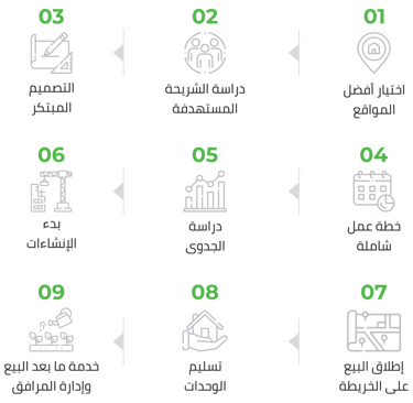 نحن في تمليك النخيل نتبع منهجية عمل متكاملة تضمن التميز والجودة في كل تفاصيل المشروع، بدءاً من دراسة السوق العقاري وفهم احتياجات وتطلعات المستفيدين، مروراً بإعداد دراسات الجدوى والتحليلات الاقتصادية والاجتماعية، وصولاً إلى تحديد أفضل الفرص الاستثمارية وتنفيذ مشاريع مستدامة تلبي الطموحات وتحقق القيمة.